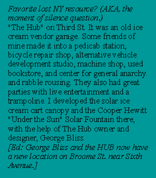 Sol of the City DB: It sounds like a lot of these collaborations came out of networking at the IDSA. Are there other groups that you've found useful in terms of resources and people? AA: Well, we already mentioned the NYS ERDA. Around the time I was getting involved with the IDSA, we also formed the New York chapter of O2. At the time, O2 was a European based environmental design organization. Now there are chapters in several cities. DB: One of the great things about O2 is their philosophy