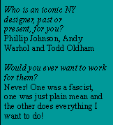 DB: You mentioned that your work in the DUMBO arts center was to find people to collaborate with. Have you worked in collaboration with others? RT: Not really. And, it's funny that I would be looking to collaborate, because the few collaborations that I have worked with, were kind of miserable experiences. (laughter) LG: In what way? RT: I guess I haven't figured out the best way to be really nice, and work happily with someone, while at the same time, very strongly voicing my opinions too. I have always found for some reason, that I get barrelled over. DB: …You lose your voice? RT: Yeah. LG: It's because you're nice. DB: Have these collaborations been with people in the same area as you, or in other fields, where you're putting together diverse talents? RT: It's been in the same fields… DB: …That could be harder. RT: Maybe it's better to find somebody who is in something that is maybe a little different, so that our combined efforts become something new. DB: One of the things that we, as Visual Seltzer, are interested in, are collaborations, and crossover fields. Where people, because of their proximity here in New York, are finding people with perhaps related interests, but different areas of specialization. LG: David and I collaborate a lot, and it's very interesting, because David doesn't come from a graphics and fashion background, and I don't come from a product / architecture background. It's fun, because… DB: …Because of different viewpoints and different methodologies. LG: And we're from very different schools of design. We've had very different types of educations. It definitely is interesting and it's fun and we love it. But, I've also collaborated with other graphic designers, and have felt totally, completely steamrolled. RT: Exactly. And I don't know how to exactly deal with that. DB: I think it's interesting that you see the collaborations not working so much for you personally, but you want to help engender them, and use some of that cross-pollination. LG: One of the things we talk about a lot is that, so many people who work in New York, in design, are very isolated. I agree, that is why sometimes doing a collaboration is exciting, because you get this infusion, and another perspective. And it's not always something that you agree with, but it's just this…this stimulating thing. RT: It kind of reminds me of my first ICFF show experience.... |